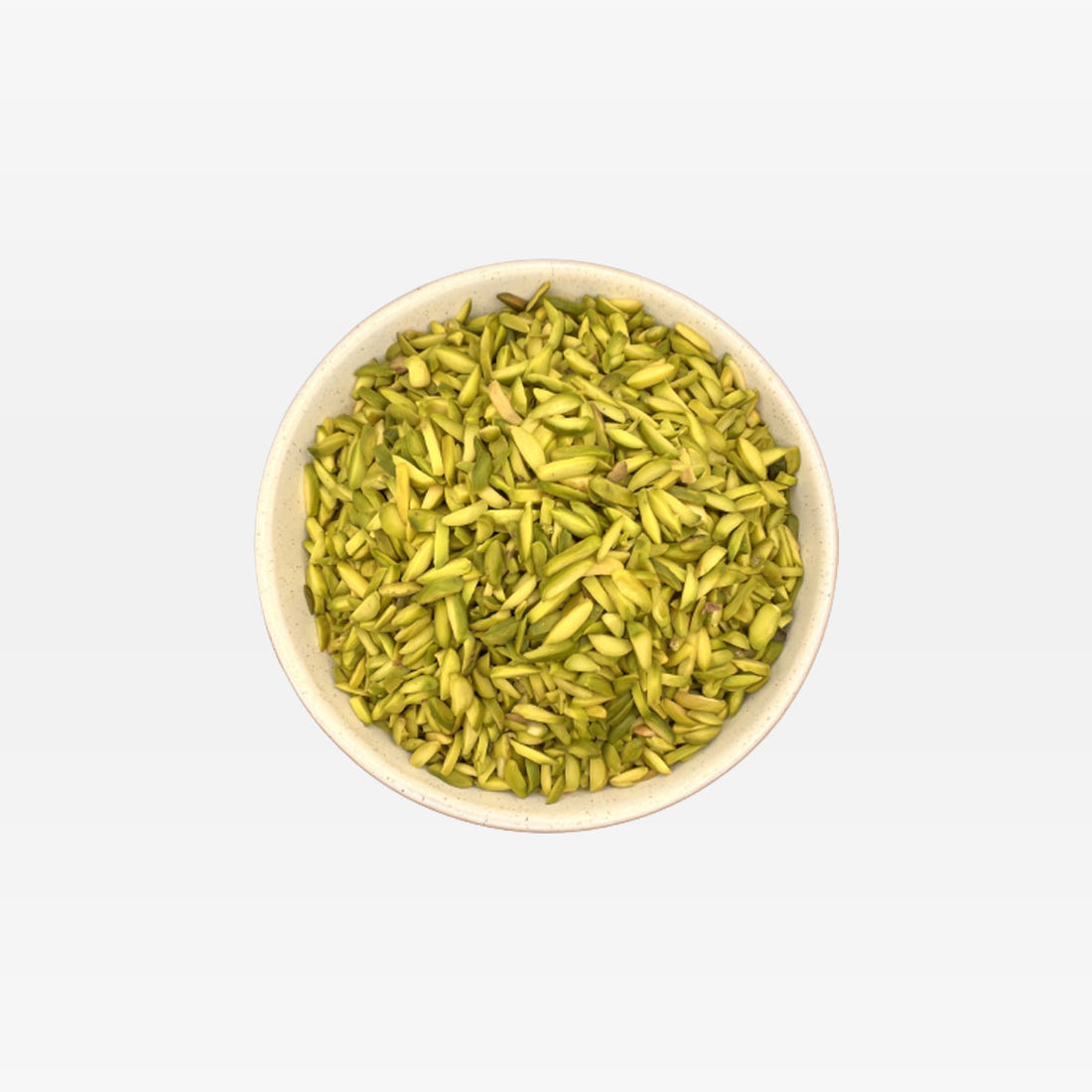 Raw Pistachios blanched and precisely slivered by machine. Great for baking and decorating desserts. This green goodness will have you thinking they are painted by how green their natural color is.